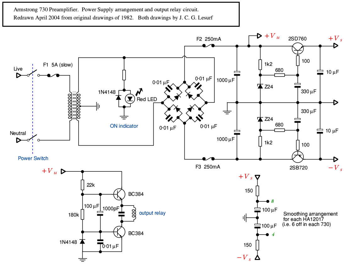 The PSU circuit diagram also shows the circuit used to operate a relay that provided a turn-on delay for a few seconds. This avoided any switch on ‘thump’. A similar circuit was employed in the 732 power amplifier. These were included as Armstrong at the time wanted to avoid any thumps at switch-on. However as is often the case these relays tend to degradewith time. Hence after 20-odd years of use my advice if you have a 730/732 is to bypass the relay - particularly if you find the sound is intermittent. The long-term unreliability of these relays is the only systematic fault I am aware of that time has shown up with the 730/732 amplifiers.
