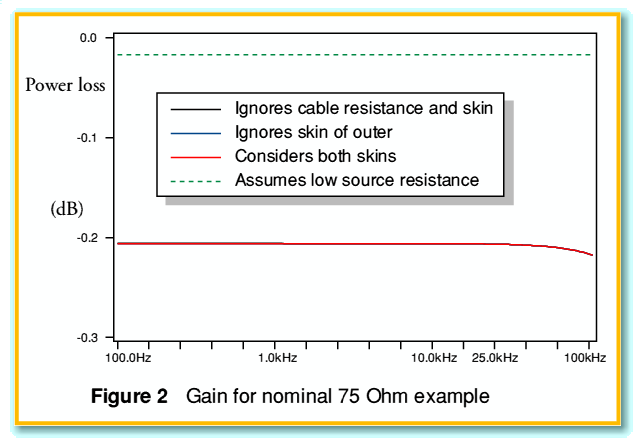 Figure 2 illustrates the gain-frequency plot we obtain for this source/cable/load combination. The figure actually shows four distinct plots. The black solid line shows the gain we could expect if the cable had an internal impedance of zero (i.e. no ‘skin effect’ at all) and the cable resistance were zero. The blue line includes the effect of the wire resistance but only takes the internal impedance of the inner conductor of the co-ax into account and ignores the internal impedance of the outer conductor (shield). The red line takes into account the internal impedances of both the inner and outer conductors. Hence the red line fully allows for any effect due to “skin effect” and cable resistance. All the plots, of course, take the co-ax nominal capacitance and inductance into account.