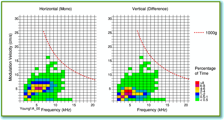 Figure 8 and 9 are for an example of a 12" 45rpm disc of classical music. It is a track taken from a set of Chopin Ballades on the Meridian label. Produced in 1980. The overall levels of modulation are very low. Listening to the disc it seems to me to lack low-frequency content, but the frequency/velocity distributions are towards the low end of the spectrum due to the absence of much in the way of large accellerations which might be expected from the starting transients produced by piano notes being played. Also seems to have a marked discrepency between the mono and difference signals.